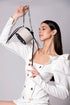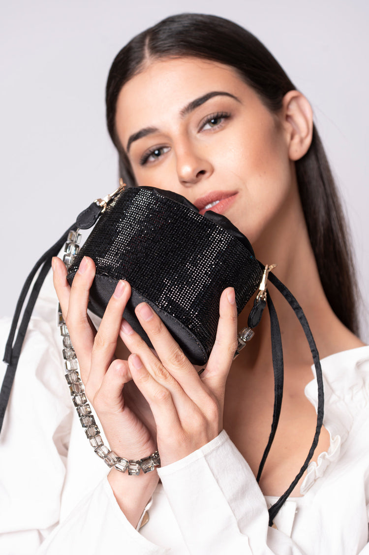 This season’s must-have bag, Cairo presents an elliptic cylinder-shaped design that is sure to complement any outfit. Crafted from crystal mesh and satin fabric, that is spacious enough to store all your daily essentials. It features our signature branded logo along the back and a beaded chain handle to complete the circular shape.