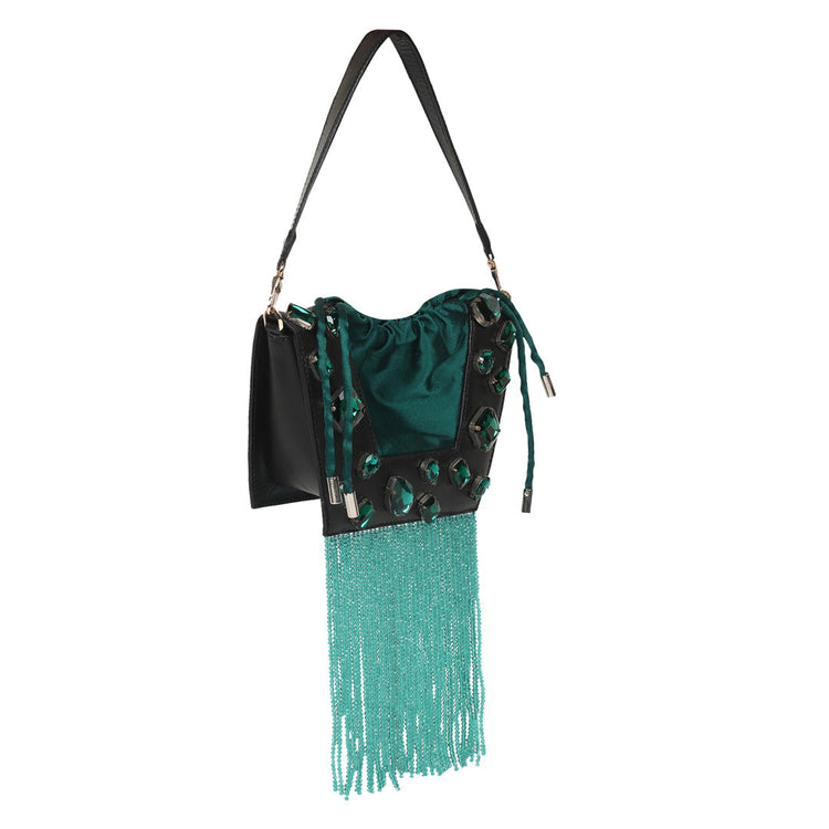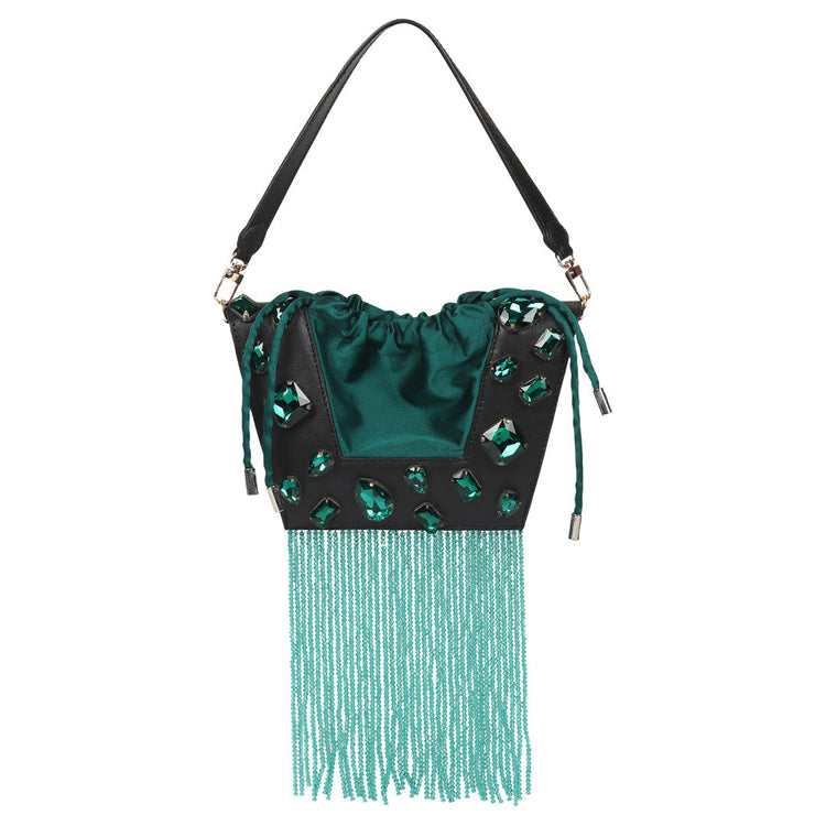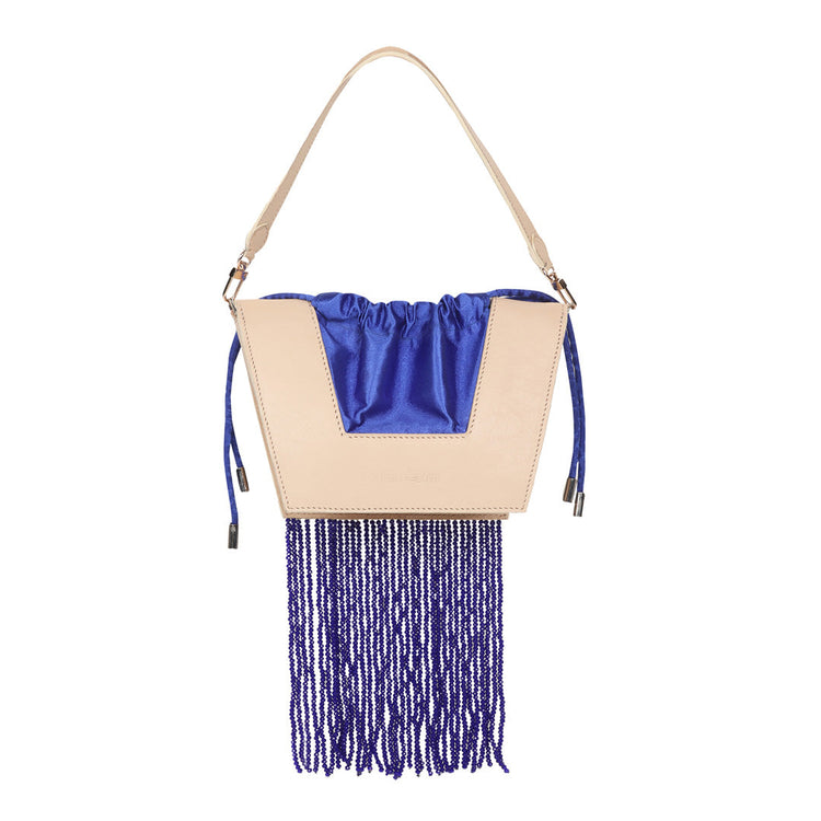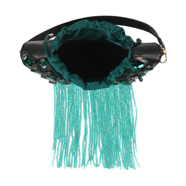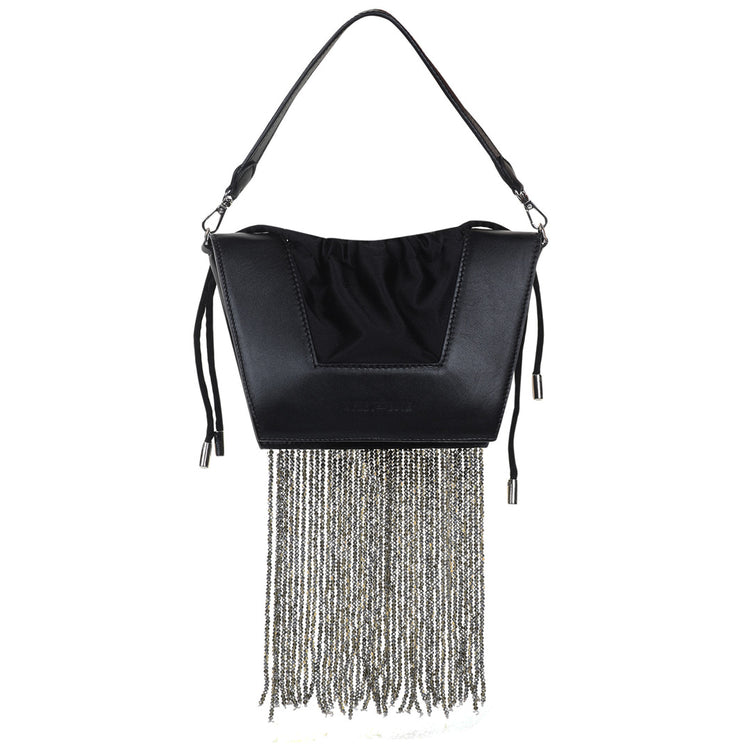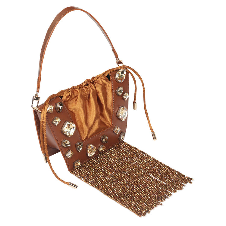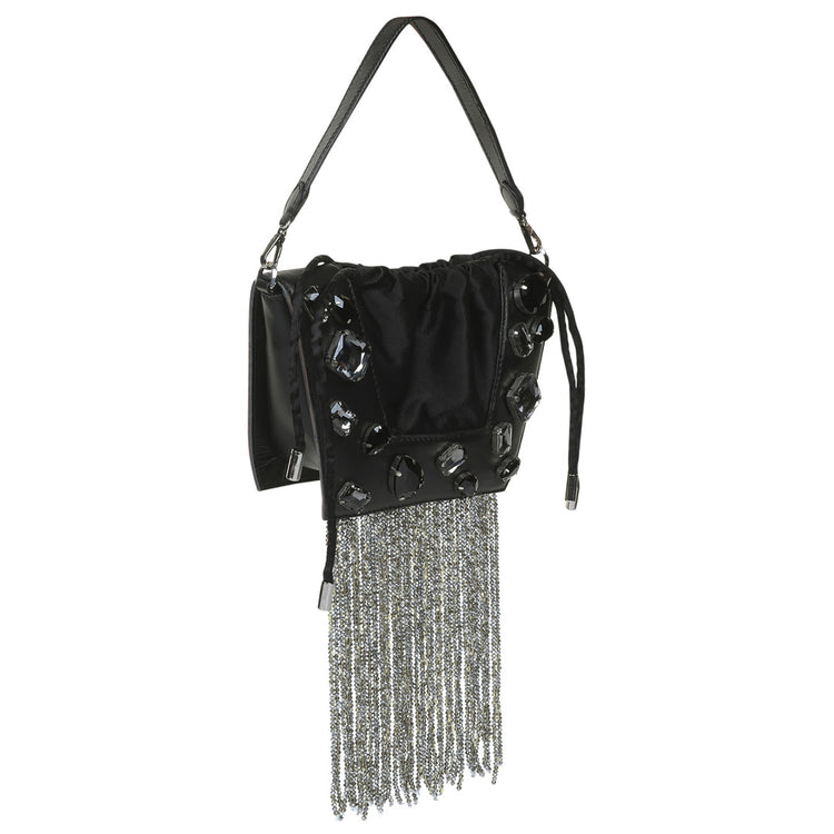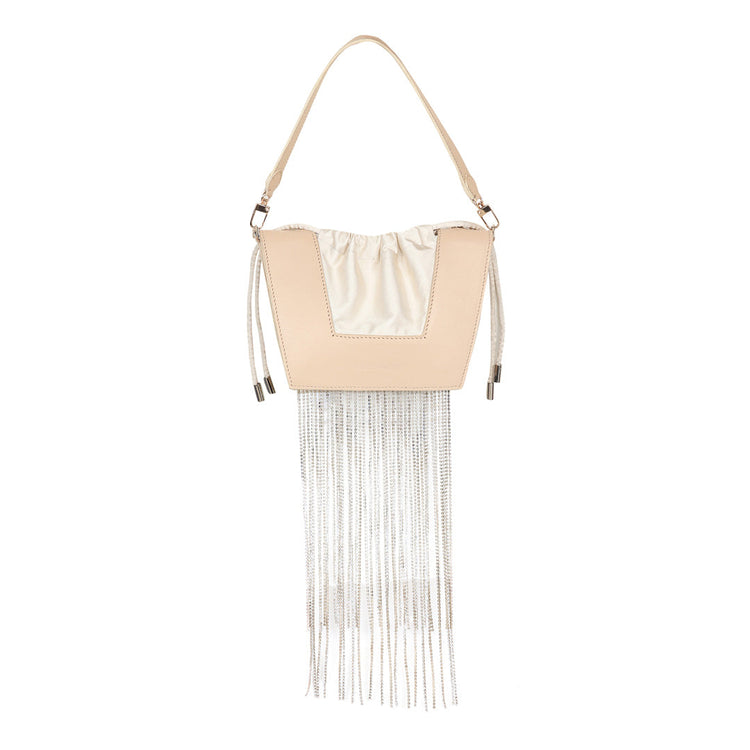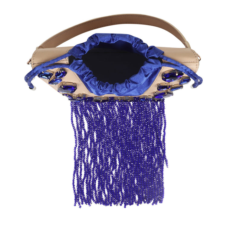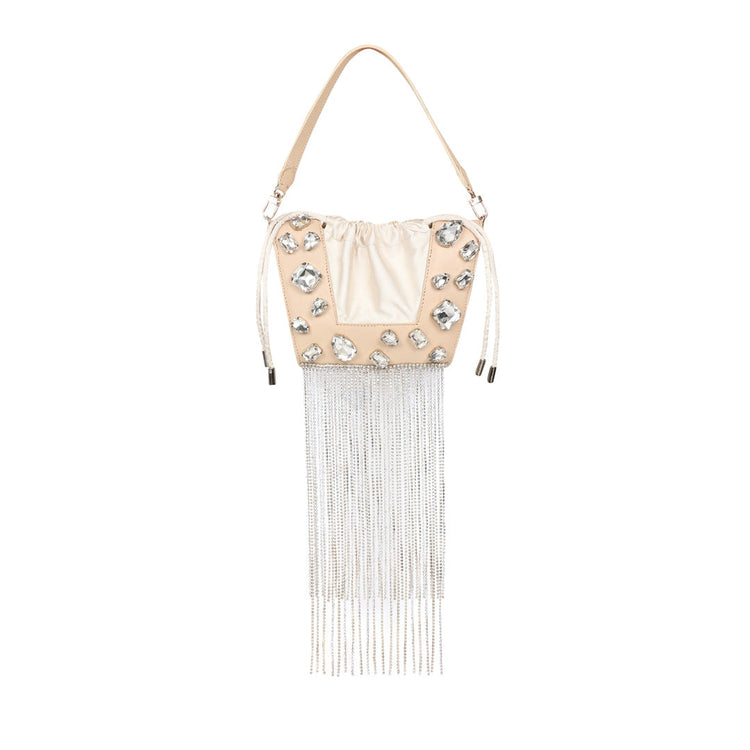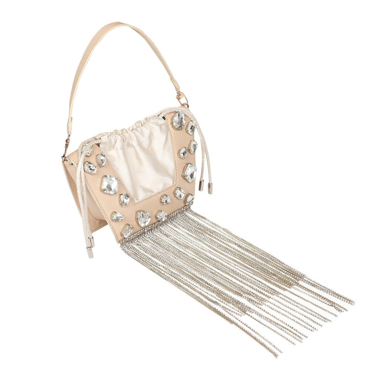 The new icon of the season, the Trapeze bag is embellished with crystal stones and handcrafted in full-grain leather. It features a satin drawstring to hold your essentials. It can be worn over the shoulder or held by its top handle. The perfect touch of glamour to any outfit.