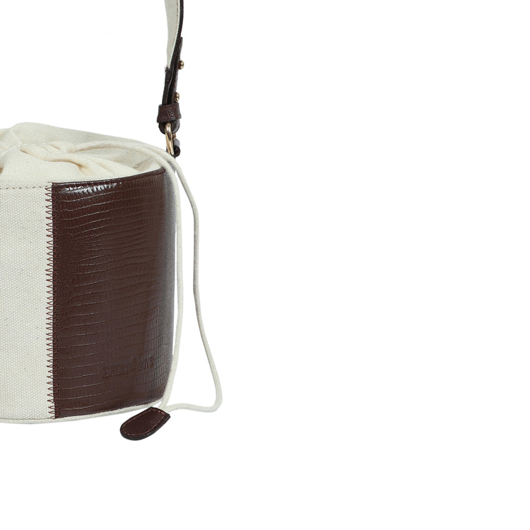 With a drawstring closure that allows for easy access, this bucket bag features a spacious inner compartment. Crafted in a durable canvas/suede finish and sporting a two-tone design with our signature zig-zag detail on sides.