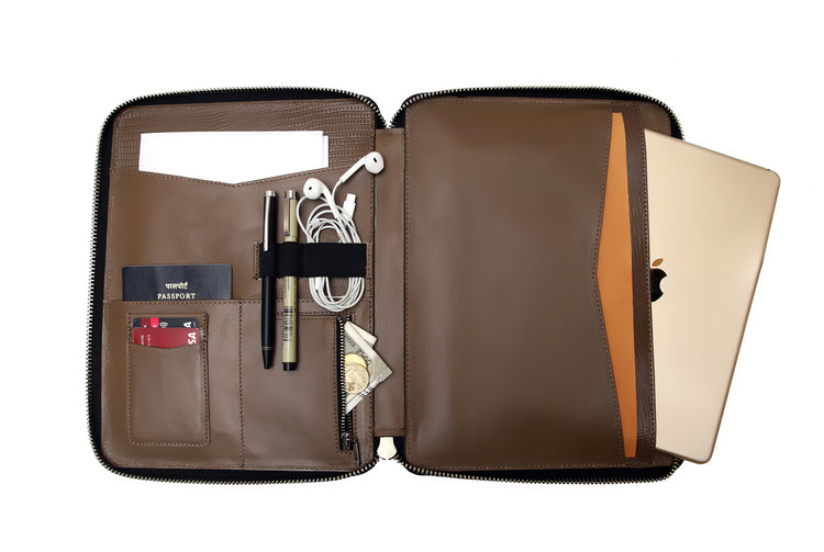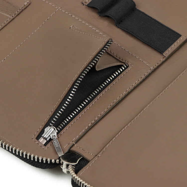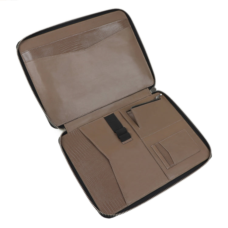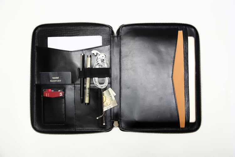 This organizer gives you the ease you need, efficiently accommodating your currency, files, and compact necessities. Small zip-pocket store currency or other valuables, while interior pockets and cardholders neatly organize your essentials, such as a notepad, documents, passport, cords and, pens. Separate pocket for a tablet lined with suede to avoid scratches. Keeps everything organized in one place.