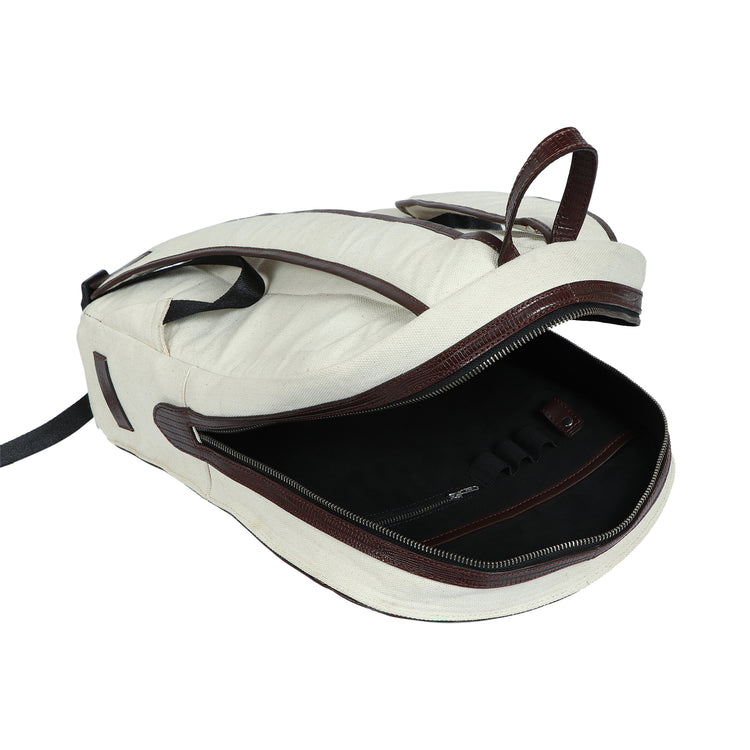 Designed to be gender-neutral, the Alpha backpack comes with all the functionalities you need to breeze through your day. It has a padded compartment for a laptop, a separate pocket for tablet, a zipper pocket, a slip pocket, loops for pens and keys. It also has an external zipper pocket for quick access to your wallet and your phone. The backpack is made of full-grain printed leather and cotton canvas. It is lined with soft suede fabric for protection.