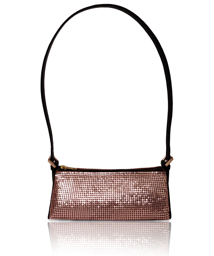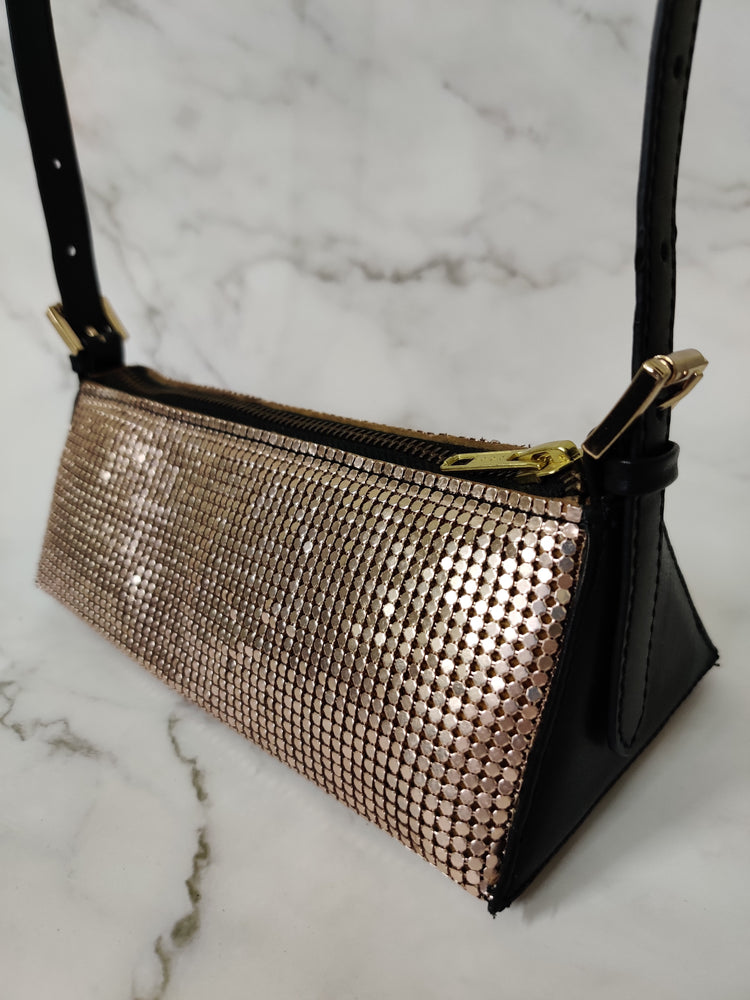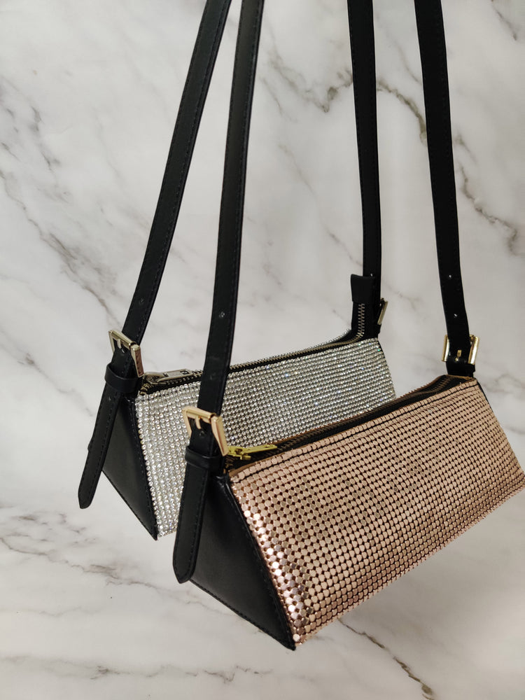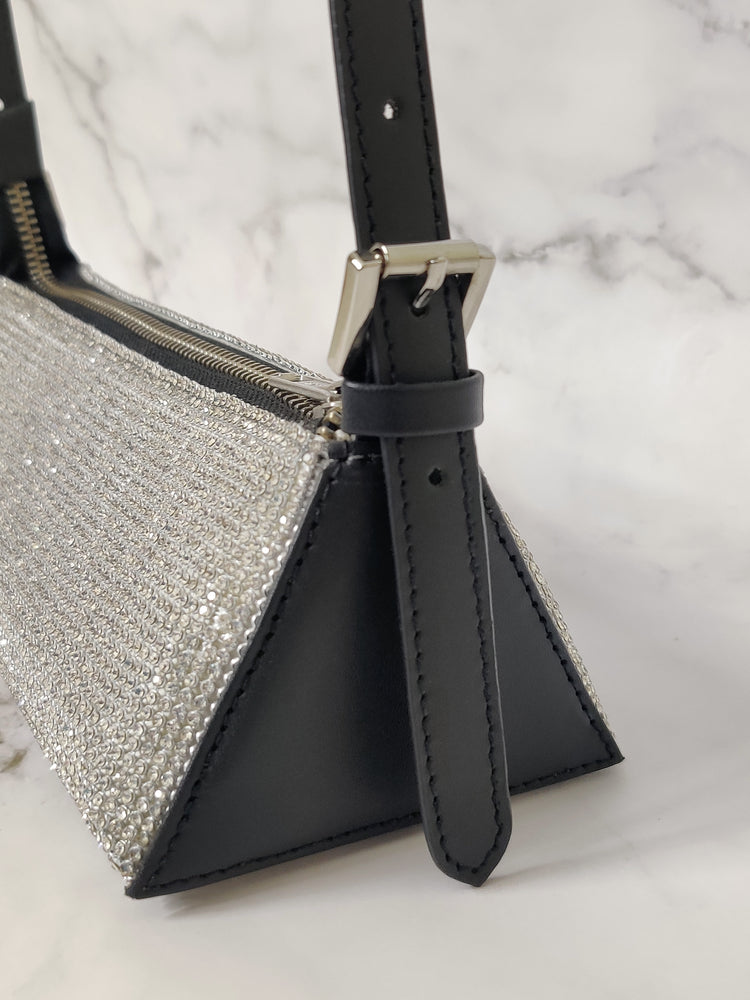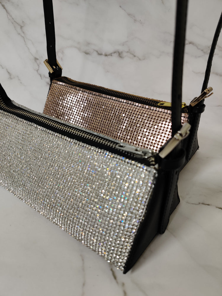 - Crafted in crystal mesh and leather